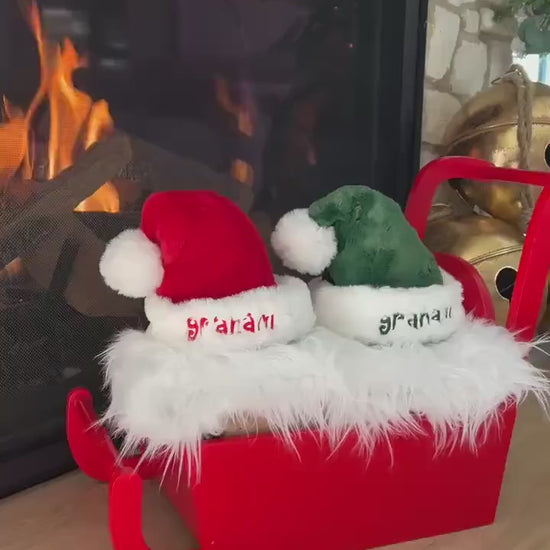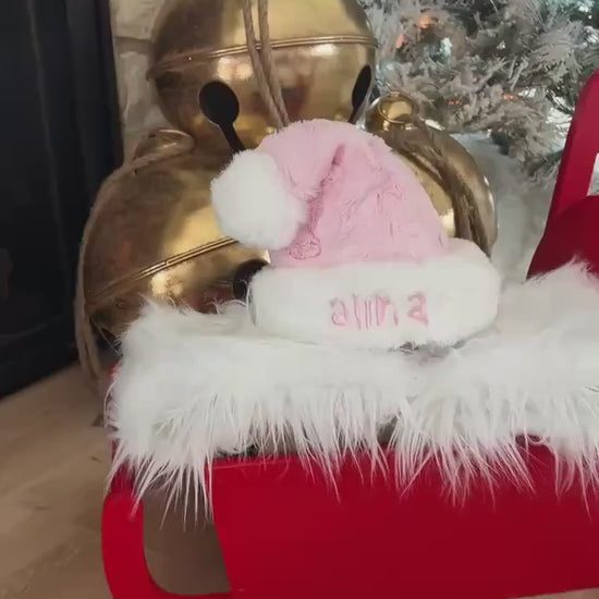 Our personalized Santa hats are lovingly handmade in the USA using luxuriously soft premium minky fabric and plush white fur trim, perfect for newborns, toddlers, and children.