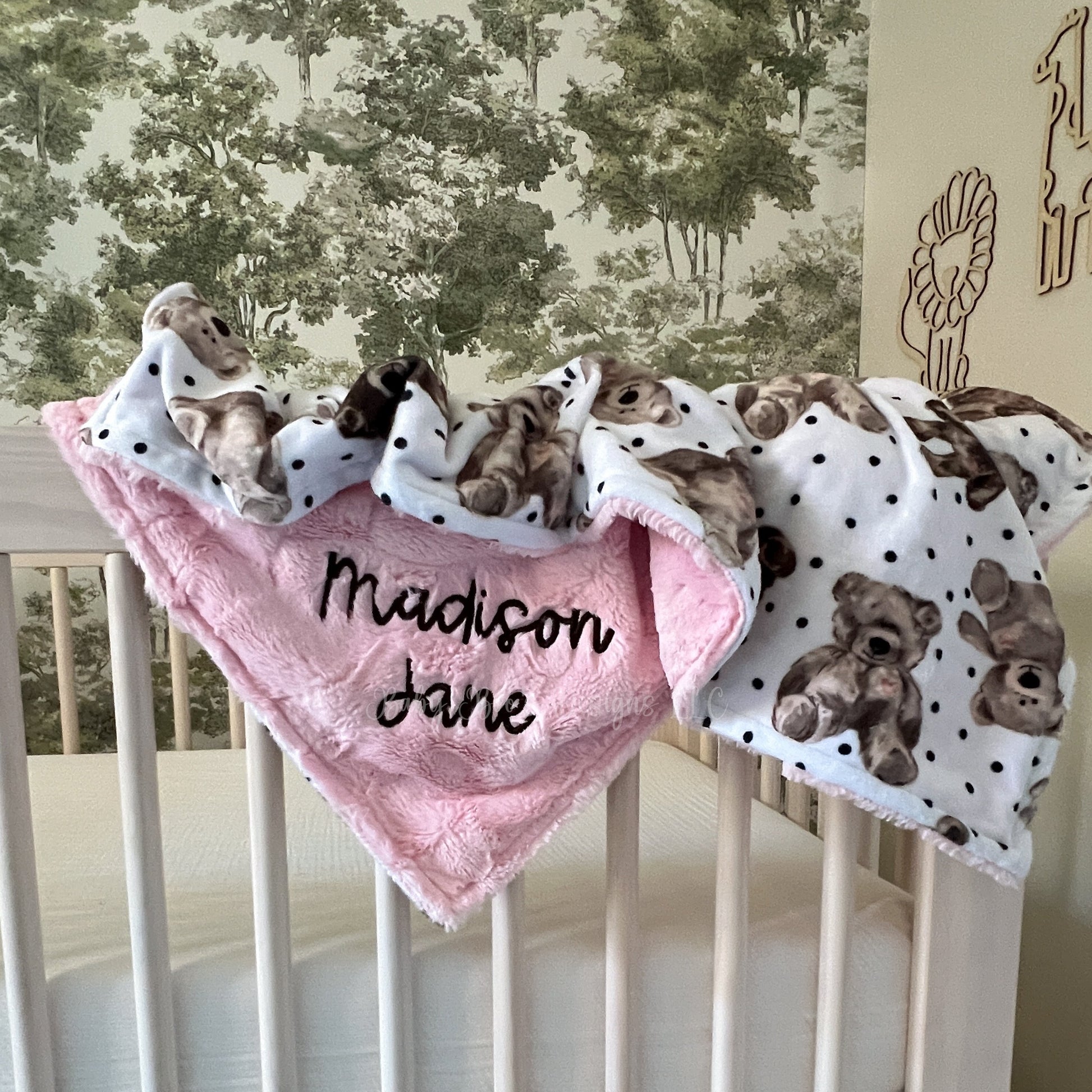 Introducing our adorable minky baby blankets, lovingly handcrafted in the USA exclusively for your little boo 💗 These blankets are not only perfect for your baby's growth journey, but they also become cherished keepsakes for years to come. Get ready for a playful twist with our selection of delightful designer prints that perfectly match with cozy minky backs. We bring together originality and practicality to delight both mom and baby.